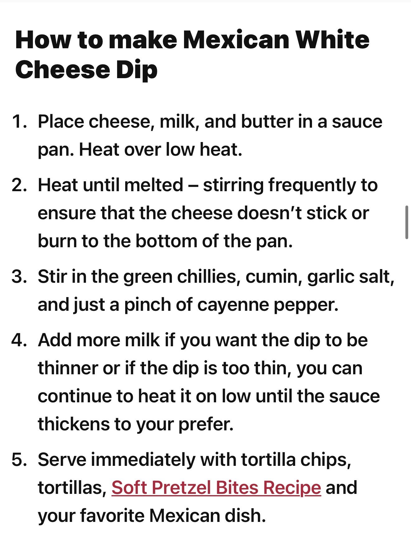 Place cheese, milk, and butter in a sauce pan. Heat over low heat. Heat until melted – stirring frequently to ensure that the cheese doesn’t stick or burn to the bottom of the pan. Stir in the green chillies, cumin, garlic salt, and just a pinch of cayenne pepper. Add more milk if you want the dip to be thinner or if the dip is too thin, you can continue to heat it on low until the sauce thickens to your prefer. Serve immediately with tortilla chips, tortillas, Soft Pretzel Bites Recipe and your favorite Mexican dish.