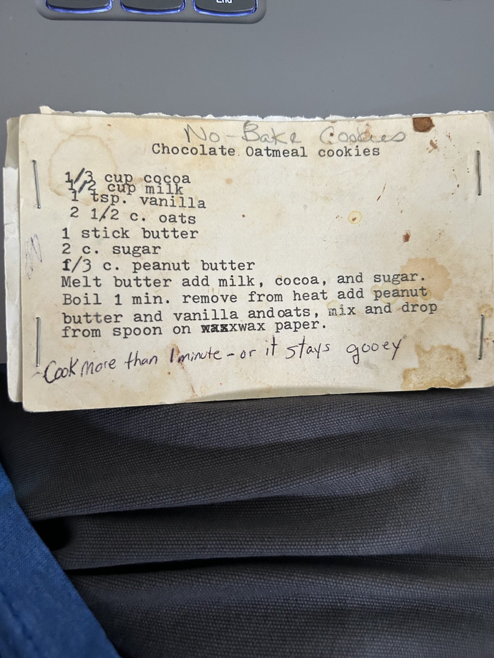 Remove from heat add peanut butter and vanilla and oats, mix and drop from spoon on wax paper.