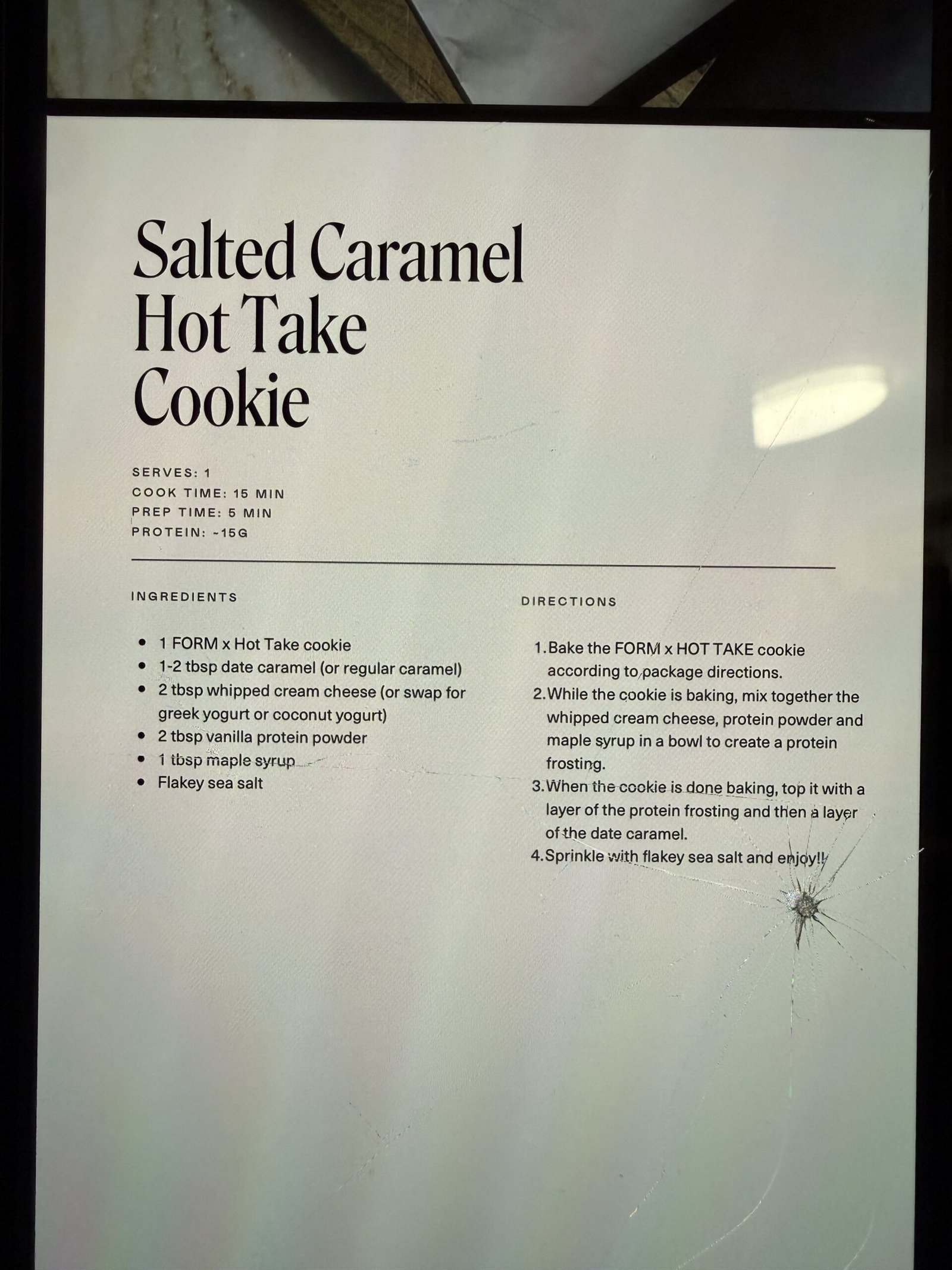 Bake the FORM x HOT TAKE cookie according to package directions. While the cookie is baking, mix together the whipped cream cheese, protein powder and maple syrup in a bowl to create a protein frosting. When the cookie is done baking, top it with a layer of the protein frosting and then a layer of the date caramel. Sprinkle with flaky sea salt and enjoy!