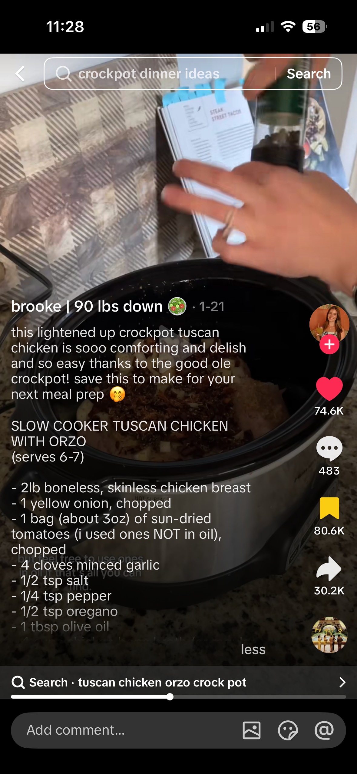 This lightened up crockpot Tuscan chicken is sooo comforting and delish and so easy thanks to the good ole crockpot! (Serves 6-7)